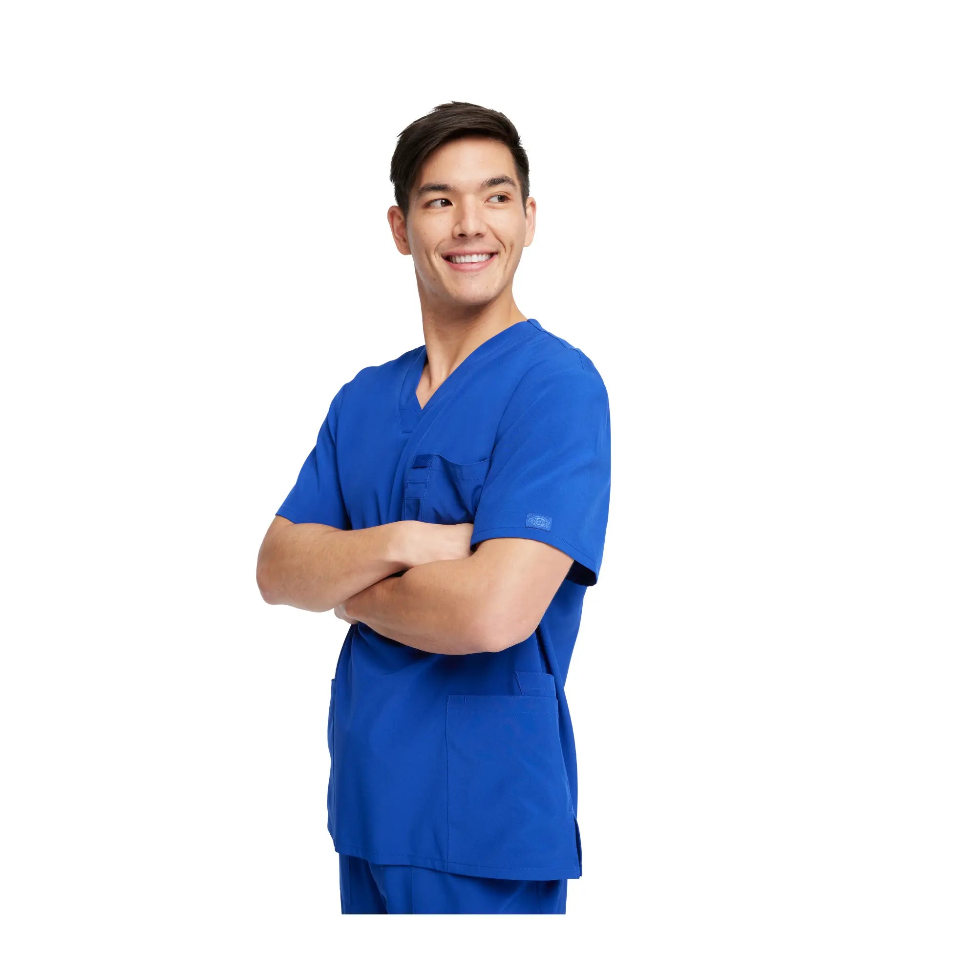 Ce haut comporte quatre poches : deux poches plaquées, une poche ciseaux et une poche poitrine avec fente pour stylo.