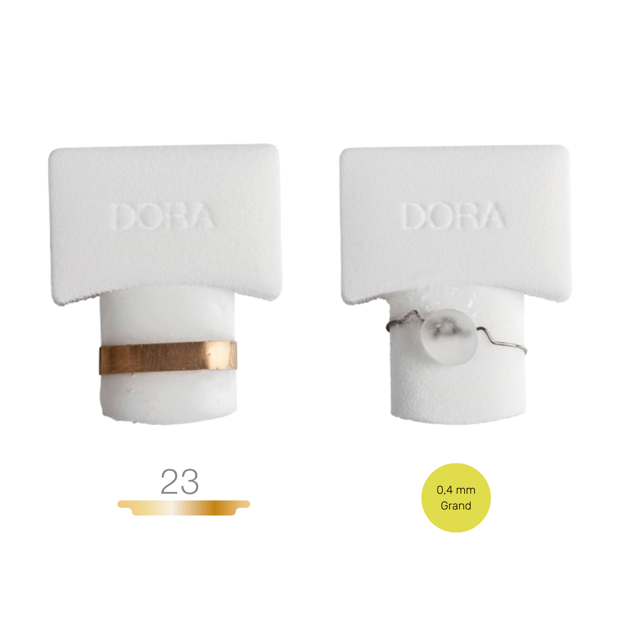 | Dora | Ongle épaissi et fortement enroulé | Double accroche 23mm | Jaune 0,40mm grand |