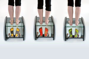 Il se compose d'une structure en bois laqué avec une partie supérieure transparente sous laquelle se trouve un miroir incliné reproduisant fidèlement la plante des pieds et mettant en évidence les différentes pressions des appuis.